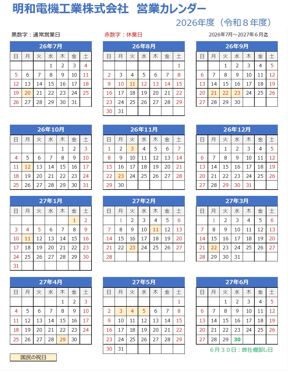 新年度(2026年度) 営業カレンダー